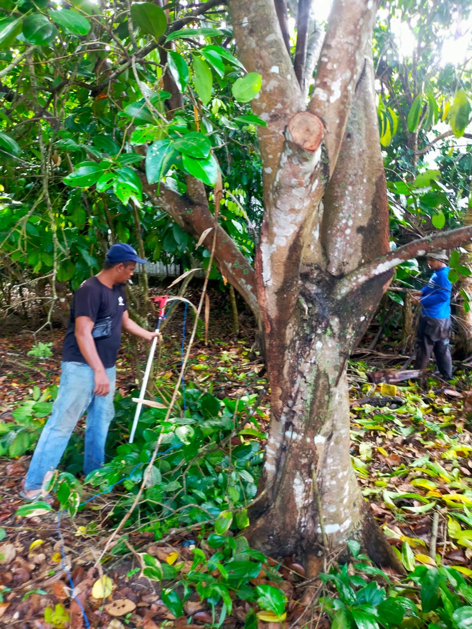 Unfortunenly , the one or two trees needs to be cut down in the kebun to lay out the site for the small garden shed . This is because the garden tools in the rumah kebun needs to be transferred to the small garden shed.