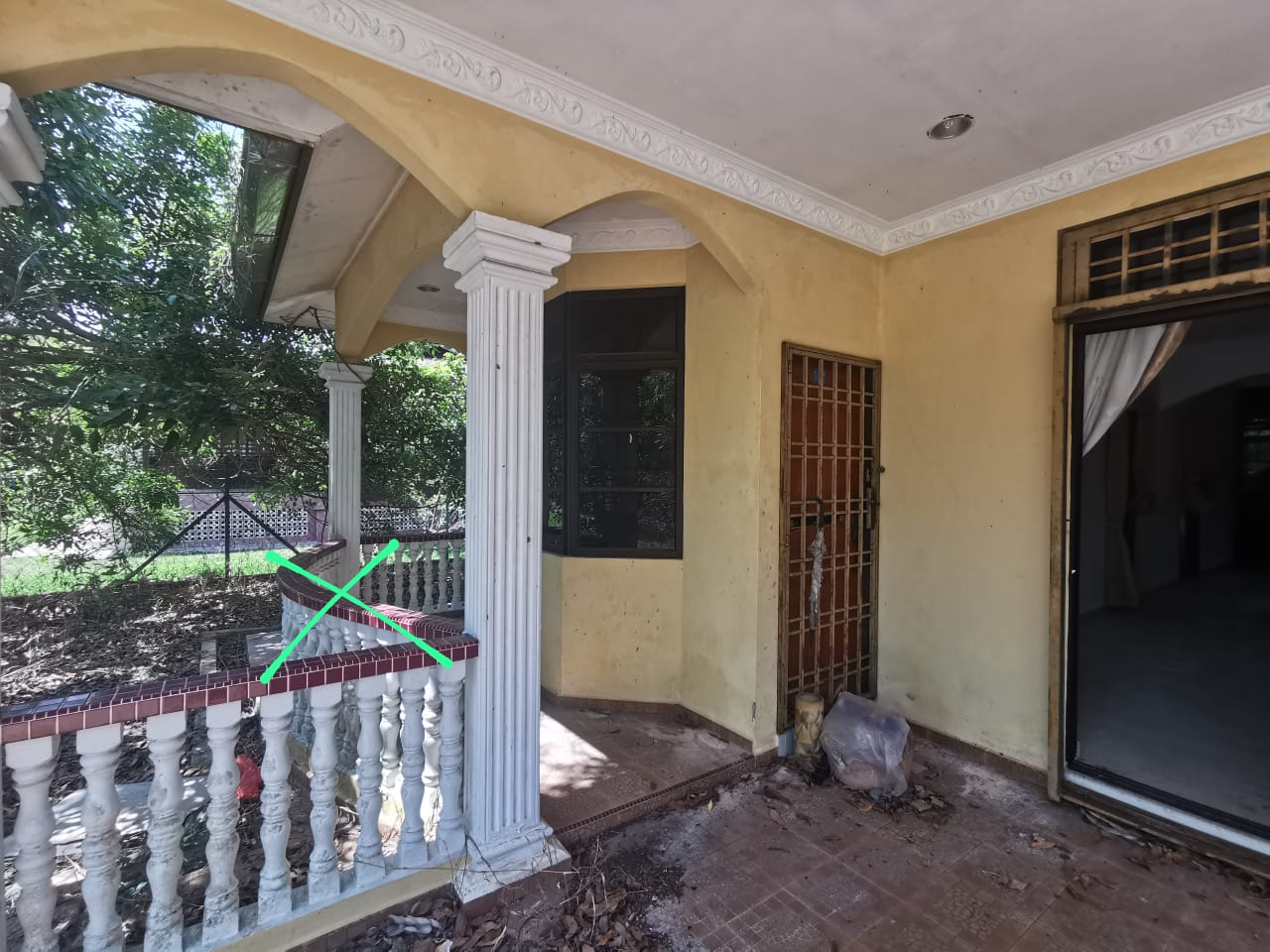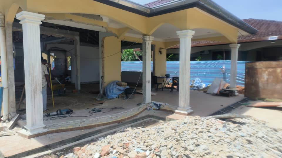 Front facade of the house as in the pillars will stand as it is but no more Greek-like pillars . Rather the pillars will not be serrated or have grooves but will be straight pillars . I do not like anything Grecian or pseudo-Grecian look alikes . I think it really looks old-fashioned and want clean straight lines to the house . The curvature at the front facade will be gone and there will be a straight line so previously , there was a little patio with grecian pillars will be gone. This means that the living room can start from the 2 pillars at the front on the left-side of the house.