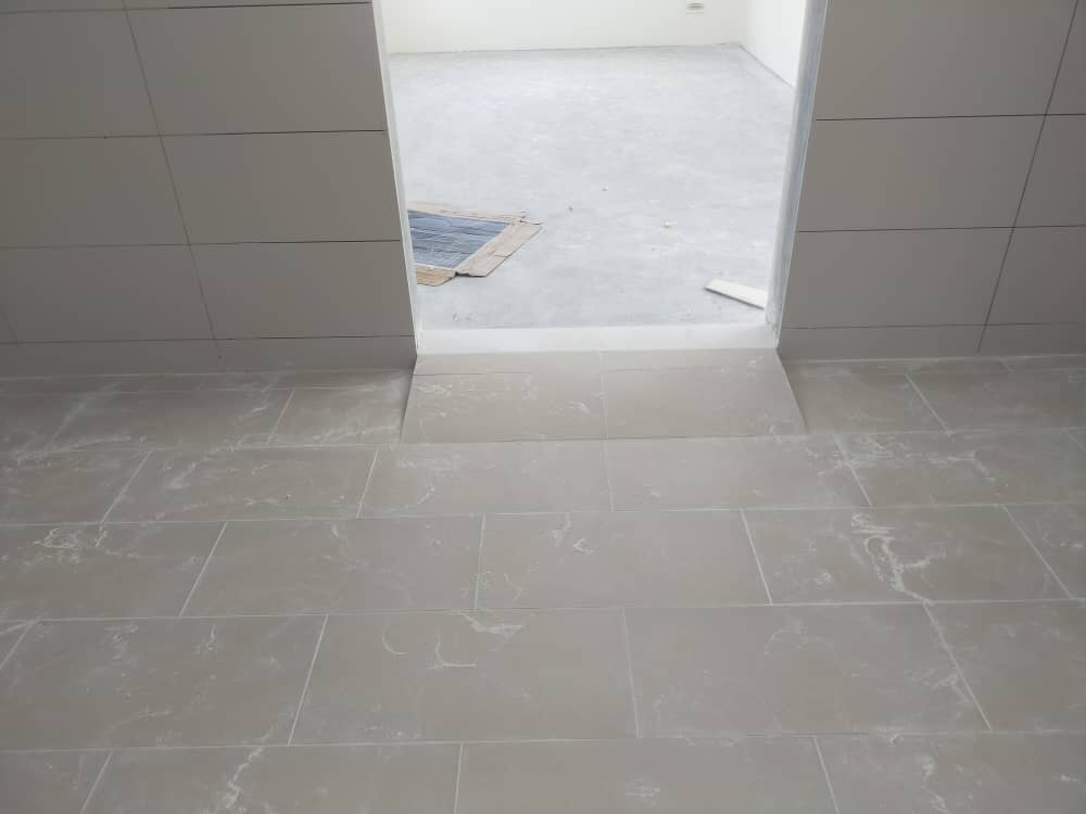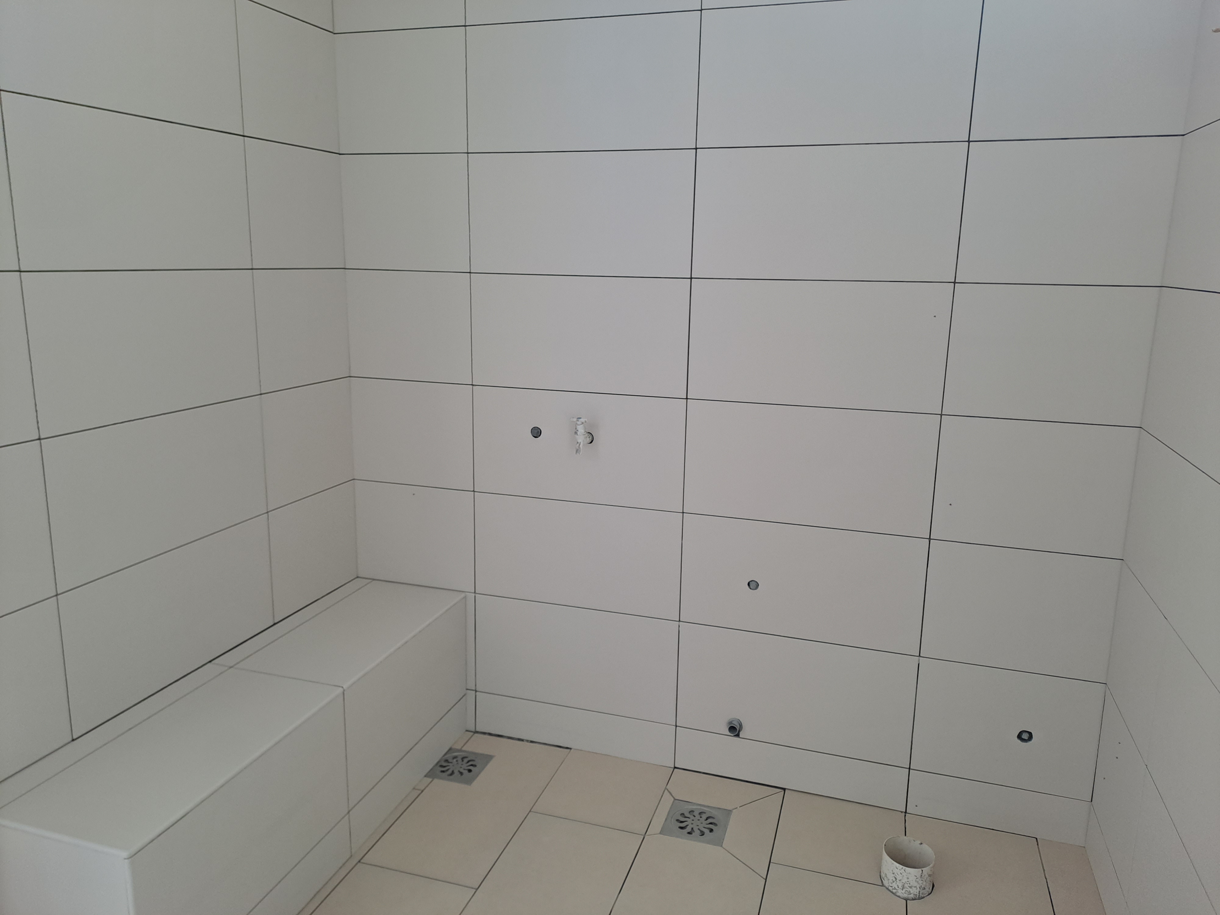 The left photo above shows the one side of the bathroom which has the stone bench for sitting down. Ideally , then you can sit down and shower . The shower accessories & toilet have not been installed yet . The layout of space for the shower and the toilet is tight because there needs to be a shower screen so that water does not splash on the toilet when showering . The left photo shows the ramp from master bedroom to the bathroom but no ramp from the second bedroom into the bathroom which is fine .