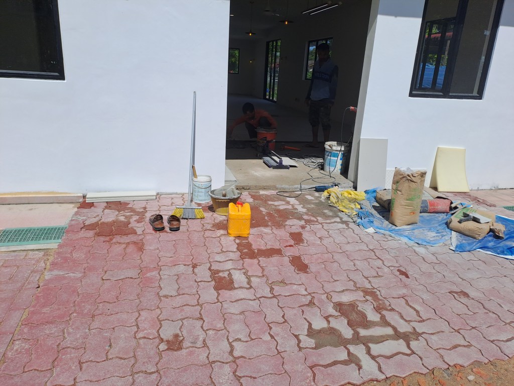 The interlocking bricks ( patio ) is sloping because there is higher level ( about the height of 1 brick ) from the house to the ground . This connects the house to the Rumah Kebun and to the Kebun . I need to install grills for the French doors, front door & the windows , sigh , Need to install CC TV too , sigh .