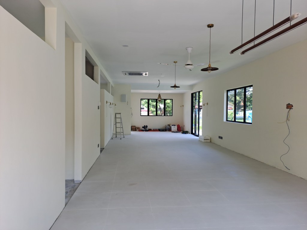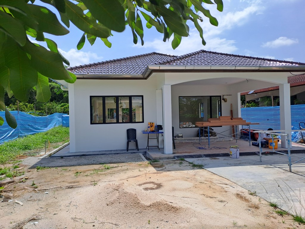 The house is almost 80% completed . Missing are the doors which are the front doors, French doors for the patio , bathroom doors and bedroom doors . The kitchen also have not been installed as the carpenter needs to get into the house to do that . The timber flooring ( herringbone pattern )of the 2 bedrooms are not done either because installation of timber flooring needs the floor to be completely dry . The installers have come 2x but the floor was not completely dry so they were unable to lay the timber.