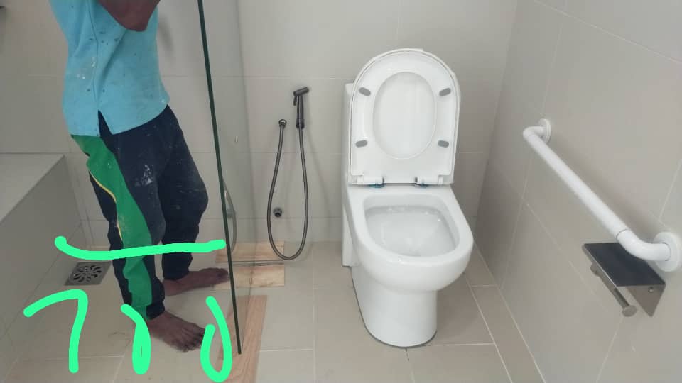 The only bathroom in the main house is shared between two bedrooms of the main house . The space for the glass partition is quite tight . The glass partition acts to prevent water from falling onto the toilet when someone is showering . The toilet area should then remain relatively dry.