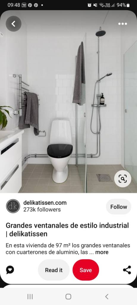 The pinterest photo on the left shows a glass divider but shows the toilet space larger than the shower but no bench and no bidet. The pinterest photo on the right shows with shower curtains which is ok too . Shower curtains are flimsy so will not take up so much space like a glass partition . However , the glass partition looks ok as there should be enough space. Do not like colored or pattern floor tiles unless they are old or original to the house . Looks crowded & fussy and want to go for a simple, clean look .