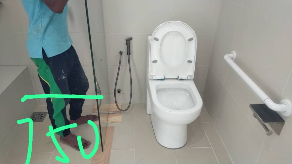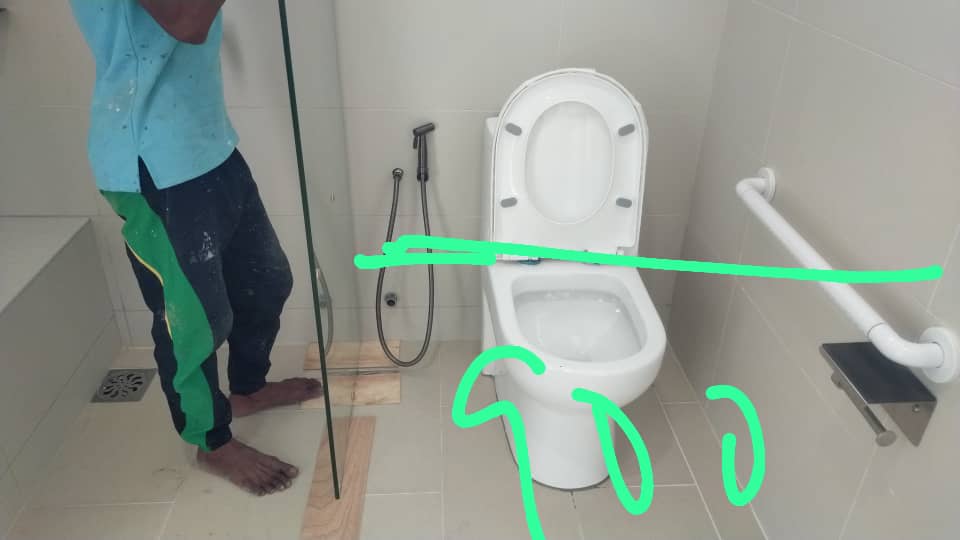 The only bathroom in the main house is shared between two bedrooms of the main house . The space for the glass partition is quite tight . The glass partition acts to prevent water from falling onto the toilet when someone is showering . The toilet area should then remain relatively dry.