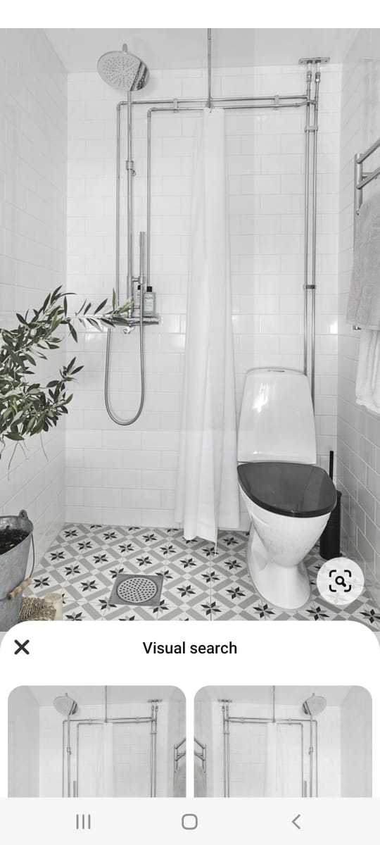 The pinterest photo on the left shows a glass divider but shows the toilet space larger than the shower but no bench and no bidet. The pinterest photo on the right shows with shower curtains which is ok too . Shower curtains are flimsy so will not take up so much space like a glass partition . However , the glass partition looks ok as there should be enough space. Do not like colored or pattern floor tiles unless they are old or original to the house . Looks crowded & fussy and want to go for a simple, clean look .