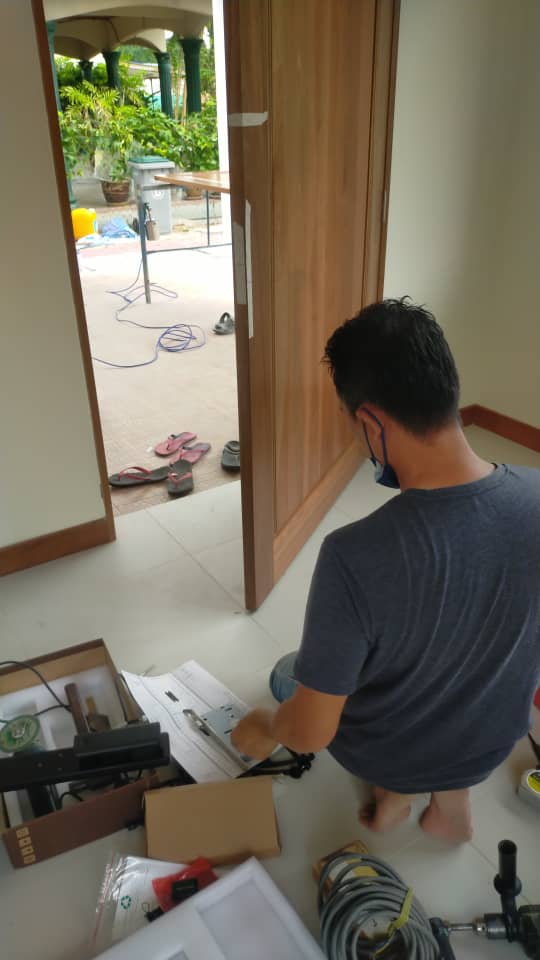 Smart Lock is installed at the front door . The Front Door is at the what-was-the-side-door of the original layout of the house . The front door is nyatoh wood and has been varnished with a natural finish .