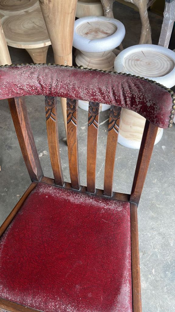 Got the other two chairs to the restorer’s factory at Bandar Sri Damansara . The chairs got moss on them . Also, the leather will be hard to replace as according to the restorer this type of leather is old and difficult to find. Also, if changing the upholstery of seat of the chair , requires also the changing of the backing for the shoulder rest. This means that the restorer has to un-do the thumbtacks at the shoulder rest . Restorer says difficult to do , sigh.