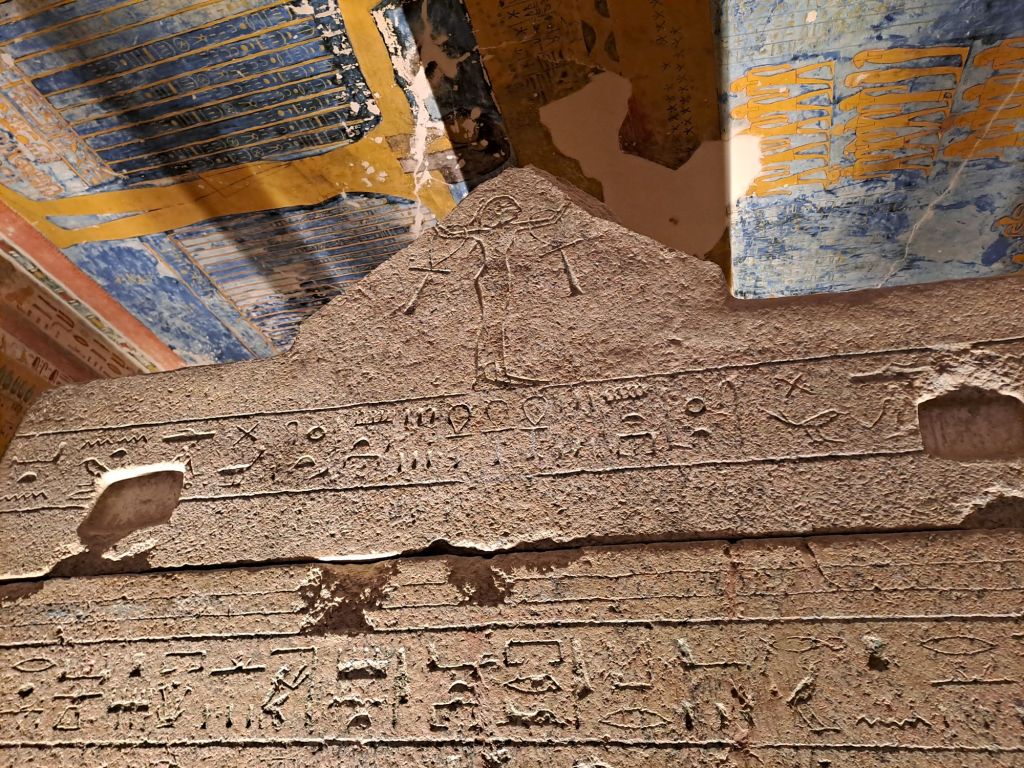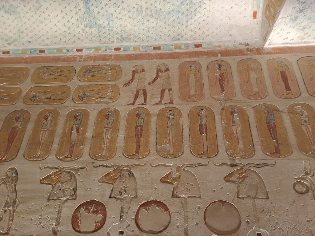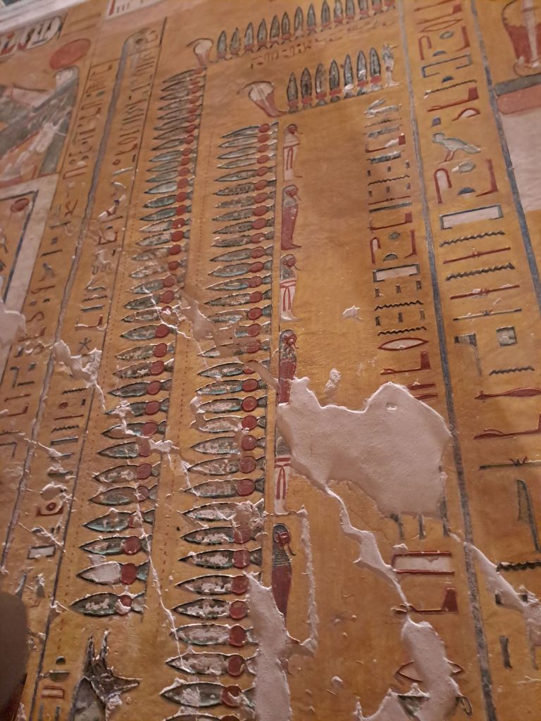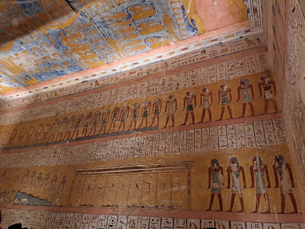 Going into the tombs was quite steep and was hot . However, this tomb is rather awesome . The mummy of Rameses IV is not there because all the mummies except for Tutankhamen ‘s body ( mummy) is being taken to museums . According to the guide, Abdul Rasool ( this happened 200 years ago ) started to find the mummies in a crypt and started selling these mummies . This is how word got out and the government stopped this selling of mummies . The mummies have been robbed of whatever artifacts were left at the mummies . But these robbers did not see the value of the mummies so these mummies were left alone . It was due to excavations or archielogical digs by Howard Carter in 1922 that these sacophagus were found .