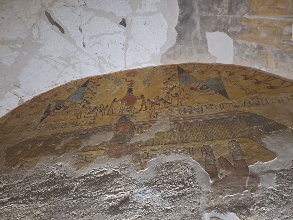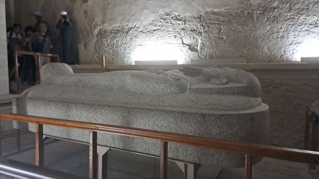 This is the third tomb we visited . The burial chamber had a huge granite sacophagus that contained this King’s mummy .