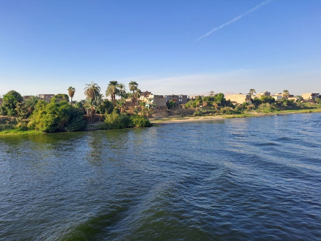 Boat is moving at last . The Nile is really the life blood of Egypt . There are green fields along side the banks . The desert beyond .