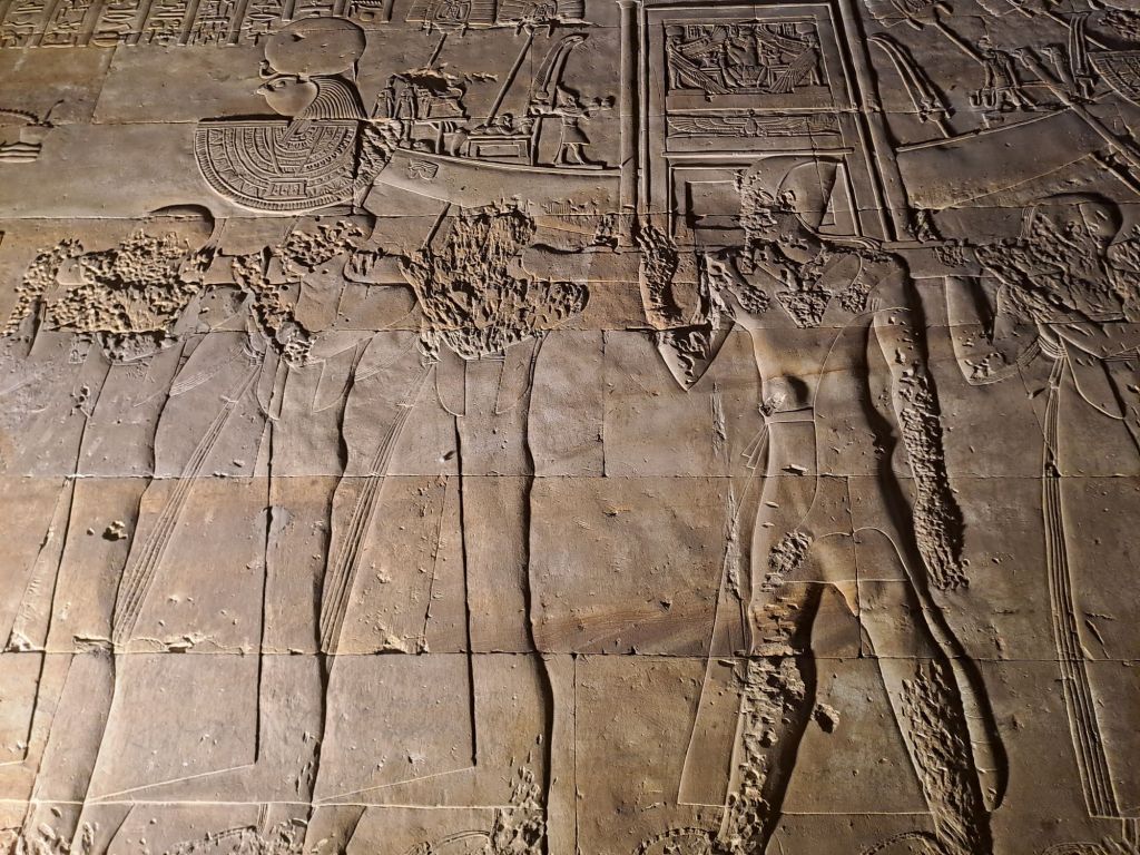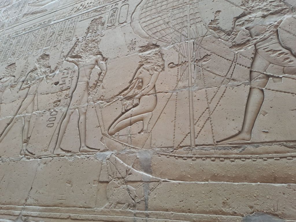 These 2 photos ( but in actuality 1 large etching but I could not capture the whole picture on my mobile camera) shows 7 priests carrying the boat with the King to the After Life . However , if one looks closely , there are folds in the etchings to depict that.there are actually 31 priests carrying the boat .
