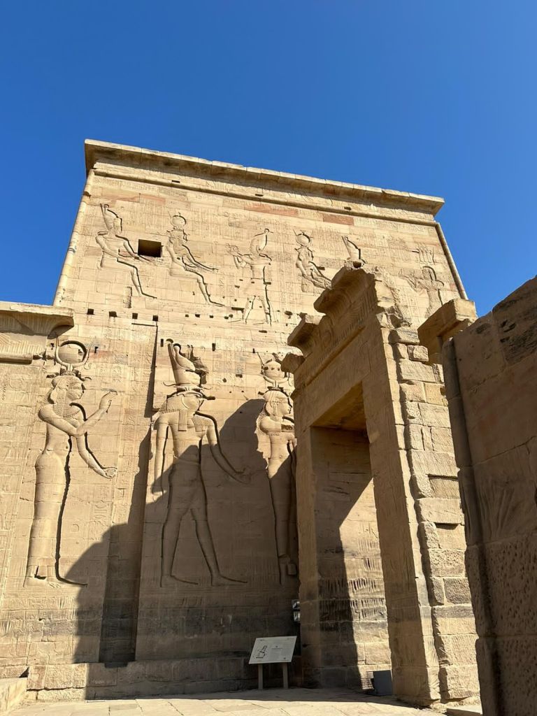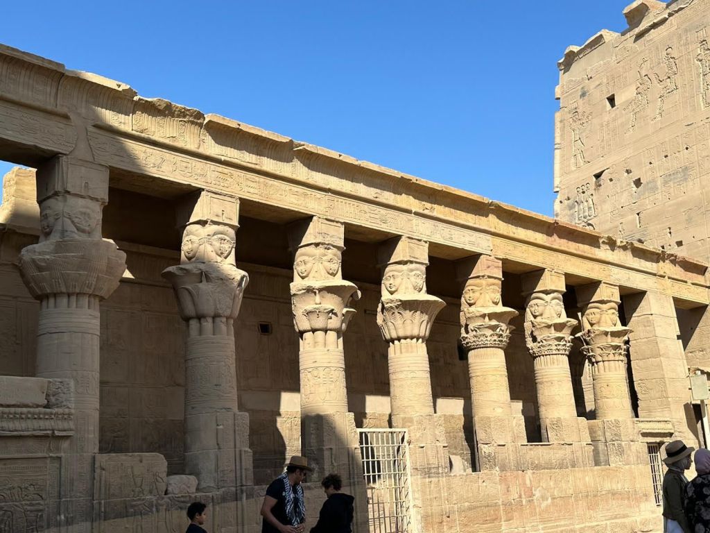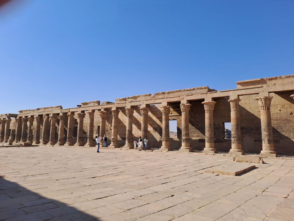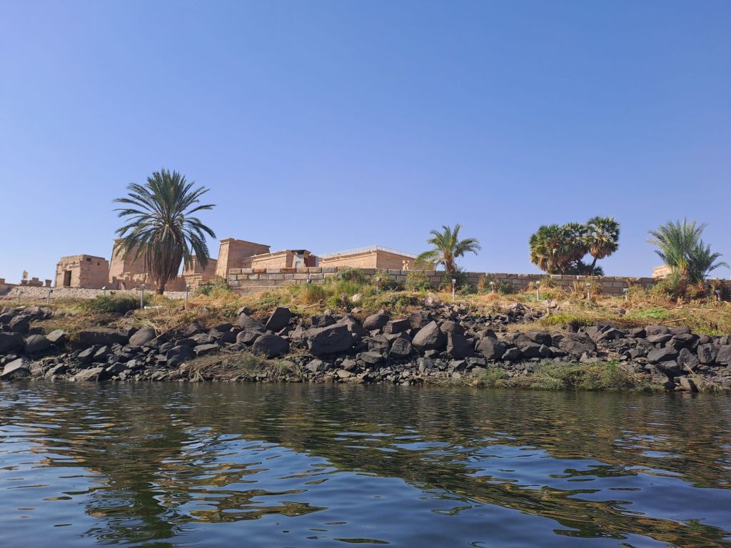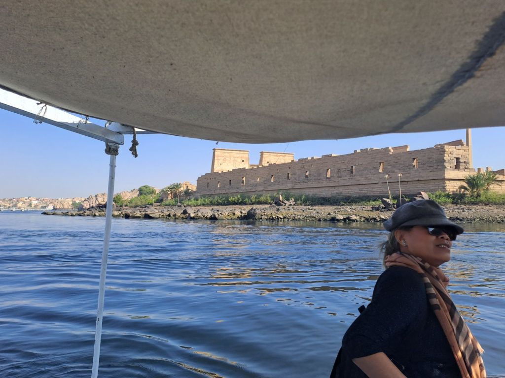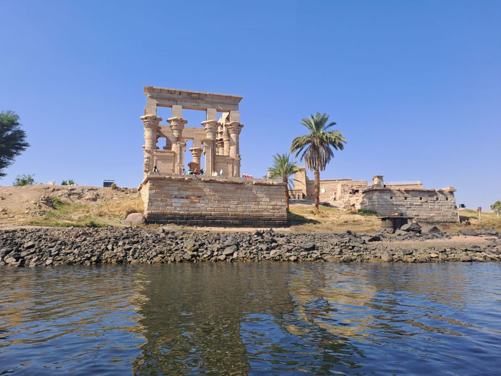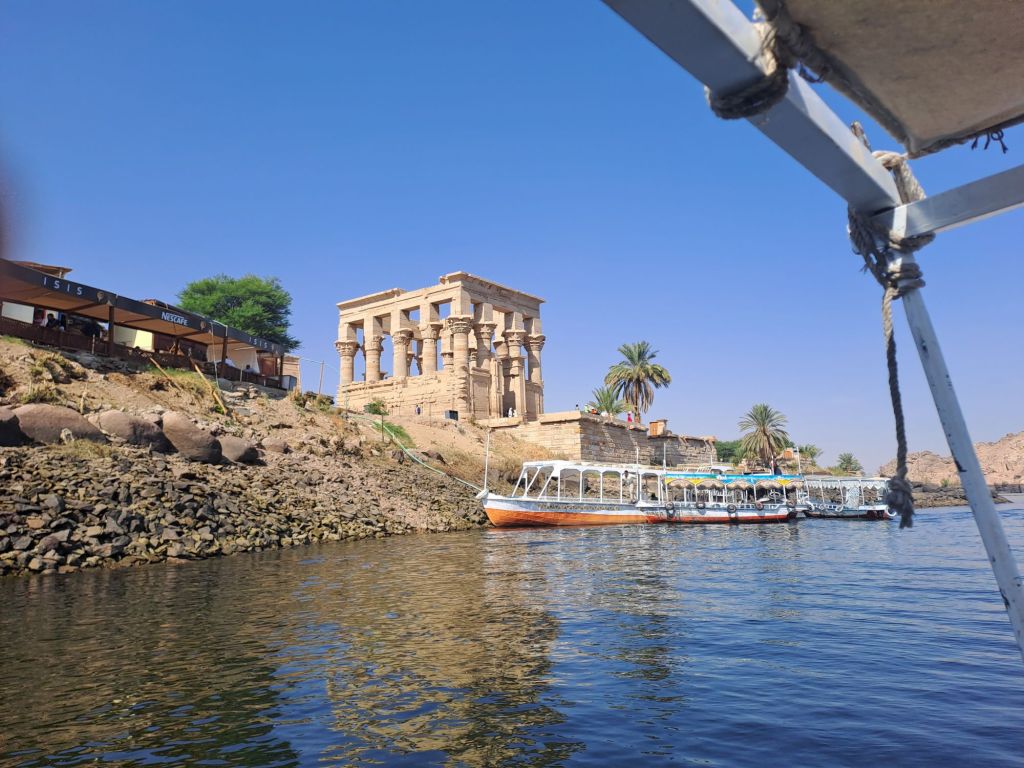 After the Aswan Dam , we took a short , pleasant boat ride to visit the Philea Temple situated at the Island of Philea . This temple’s original site has been submerged under water . Therefore , this temple has been relocated to Philea Island not far from the original site but on higher ground .