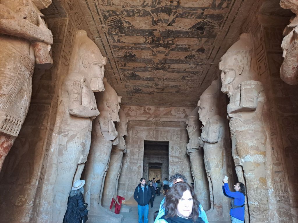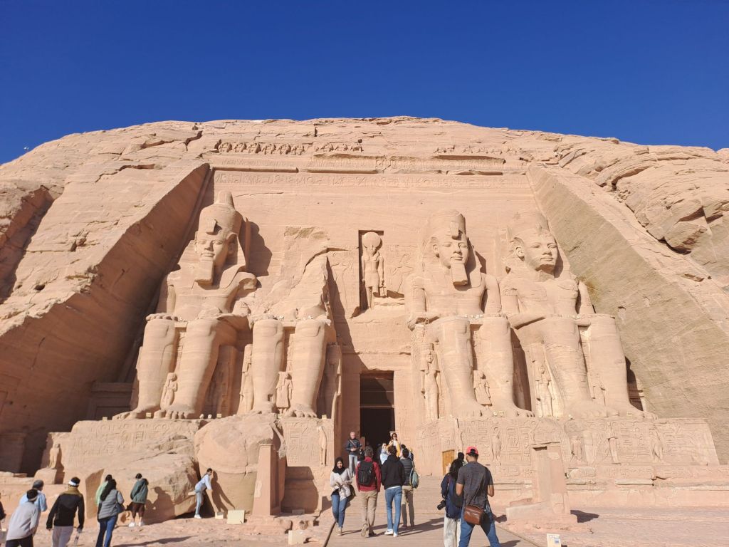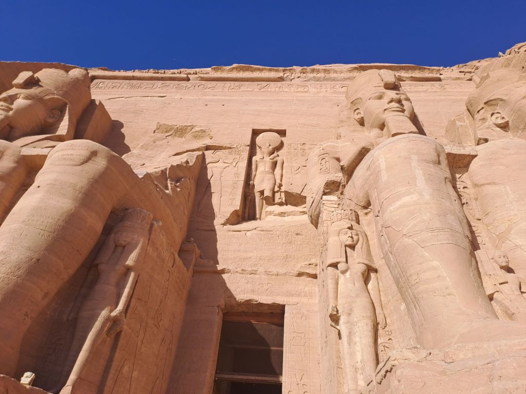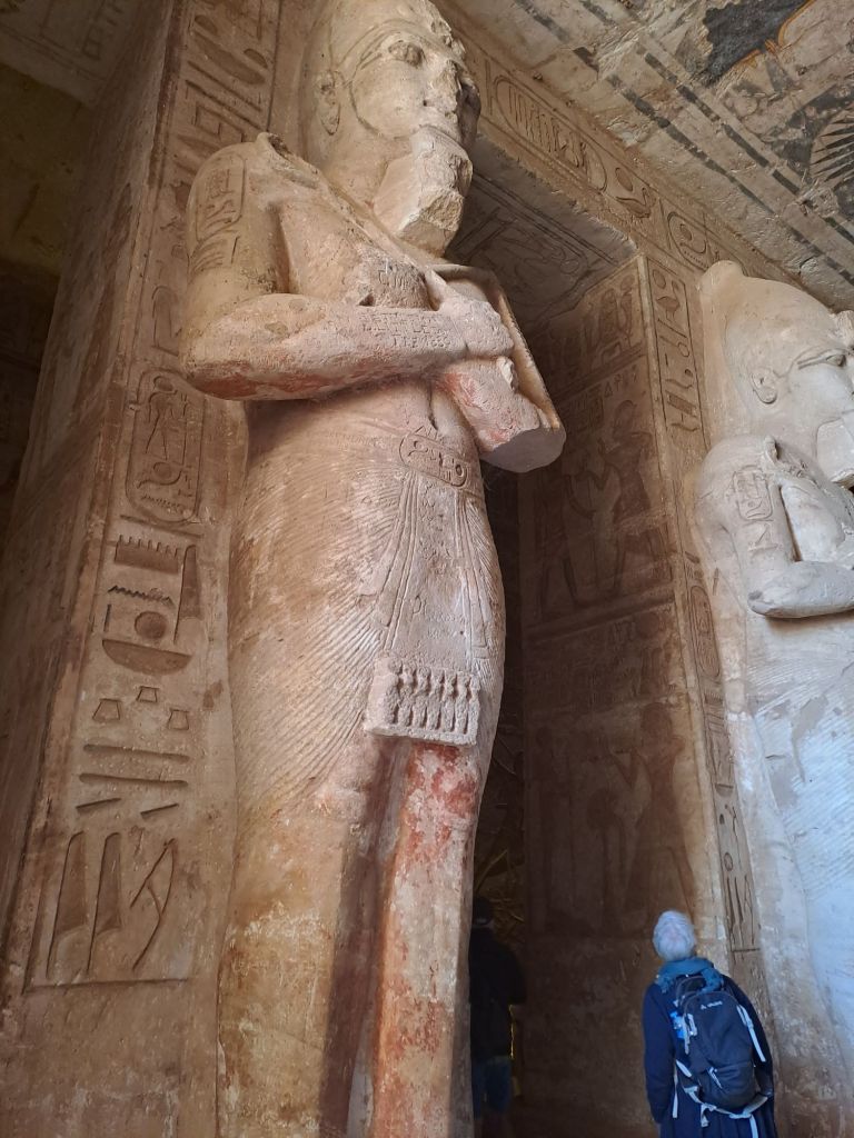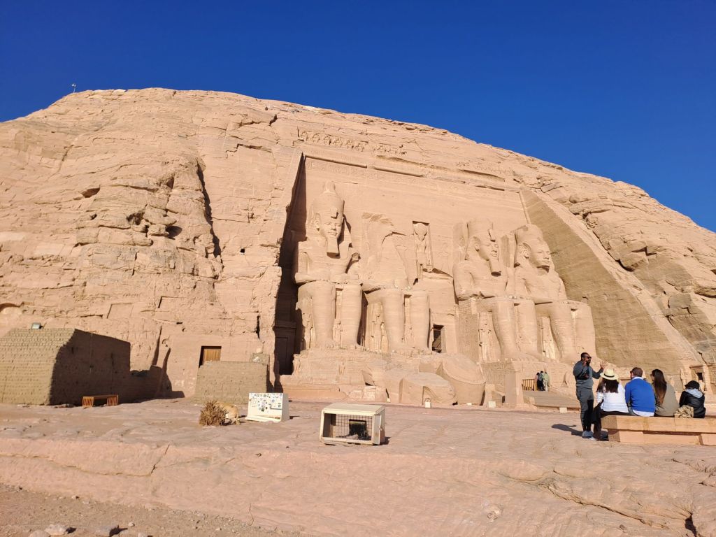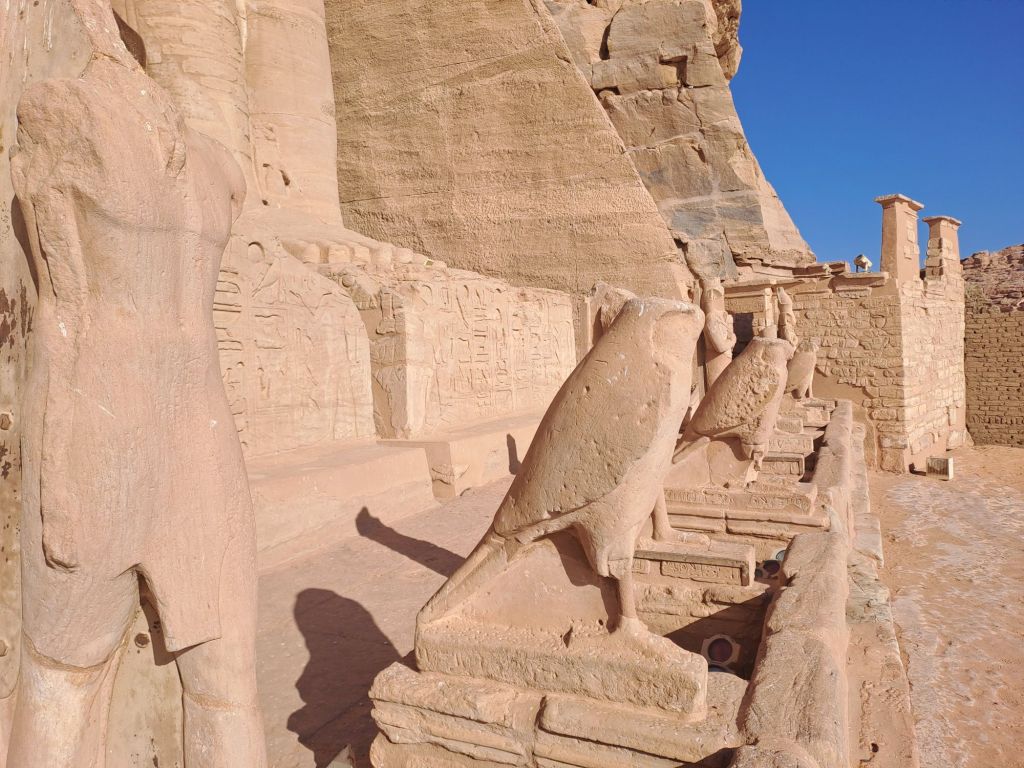 We started our walk from the entrance to the temple . The temple was carved from the cliff . Due to relocation of the temple as a result of the creation of Lake Nasser , they moved the temple in the same site but on higher ground. This had great challenges as one can imagine as they had to move stone by stone and create an artificial mountain as the Great Temple was craved out of a cliff of sandstone .