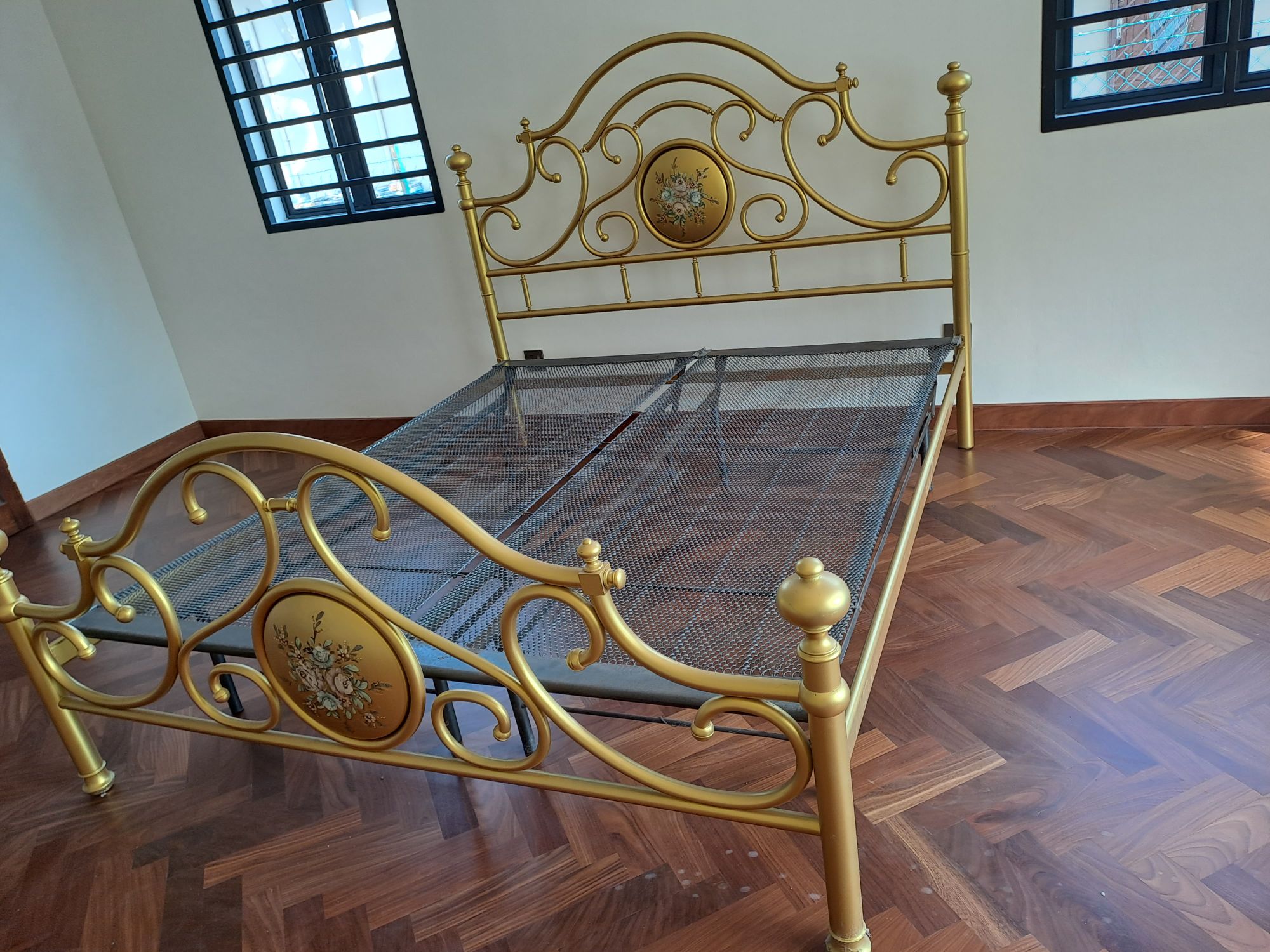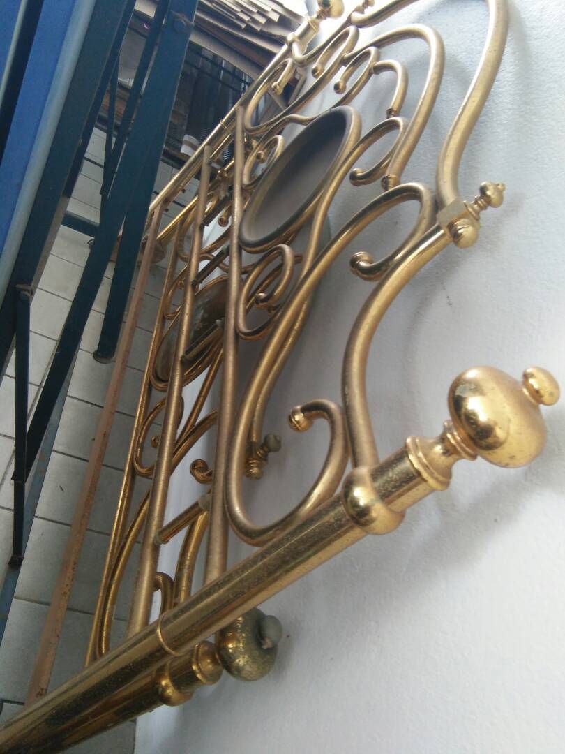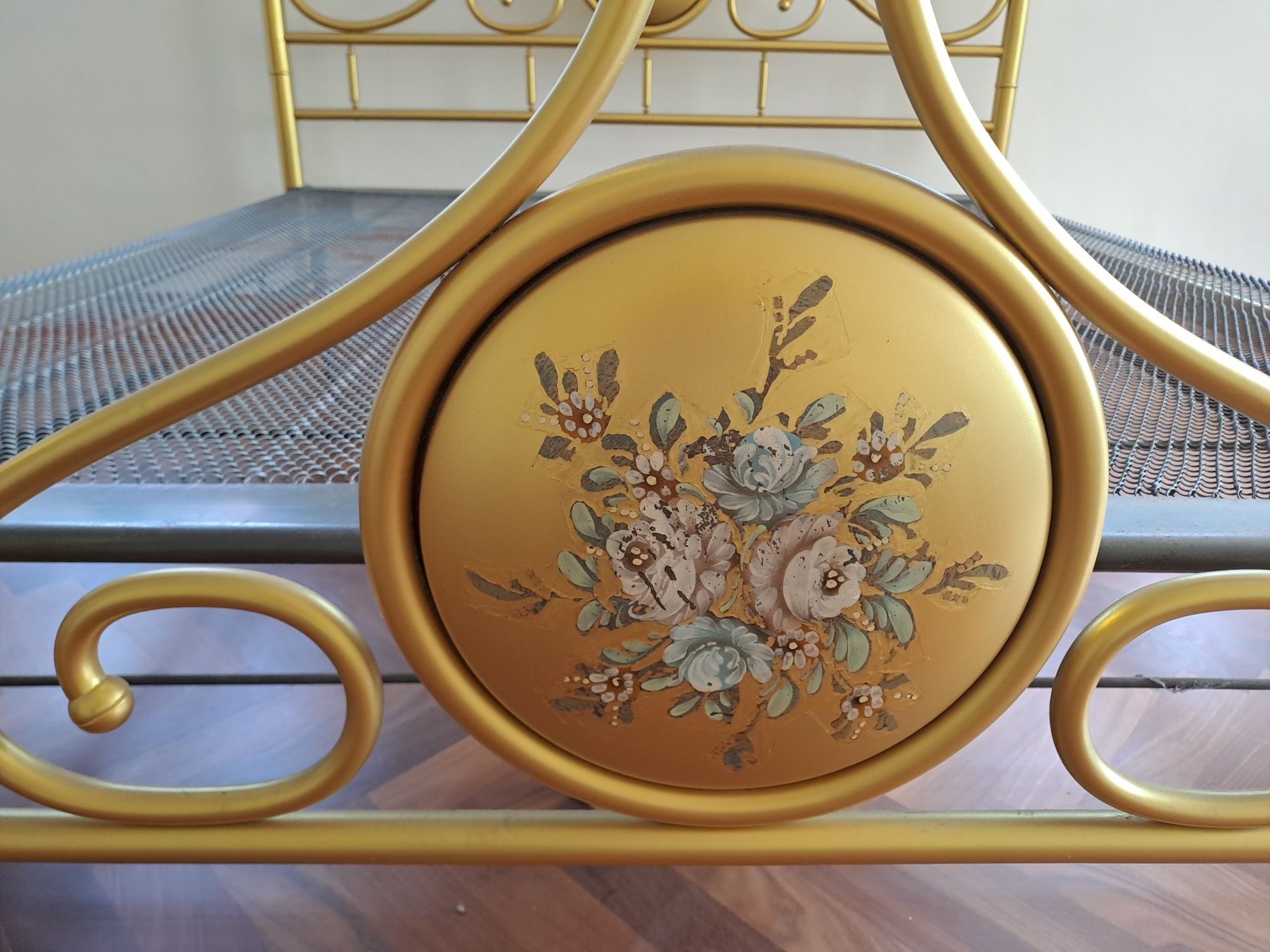 The cane arm chair is I believe in the furniture from the 1970’s . The golden brass bed is my sis’s wedding bed . The bed was a present from my parents to her for her wedding . She has been married for 40 years so the bed is 40 years old . The restorer had to re-paint the flowers as it was faded